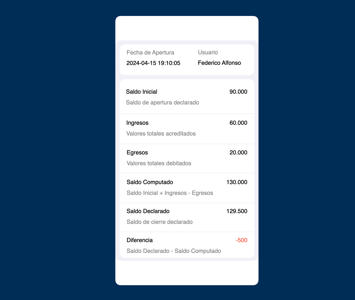 <table><thead><tr><th width="181">Título del Campo</th><th>Descripción</th><th>Origen</th></tr></thead><tbody><tr><td>Saldo Inicial</td><td>Saldo Declarado en la Apertura</td><td>JournalsDelivery.credit</td></tr><tr><td>Ingresos</td><td>Total de movimientos con signo positivo en el extracto de la Cuenta de Fondos del Repartidor en el período de la Jornada posteriores al eventual Ajuste de Saldos de apertura.</td><td>JournalsDelivery.income</td></tr><tr><td>Egresos</td><td>Total de movimientos con signo negativo en el extracto de la Cuenta de Fondos del Repartidor en el período de la Jornada posteriores al eventual Ajuste de Saldos de apertura.</td><td>JournalsDelivery.outcome</td></tr><tr><td>Saldo Computado</td><td>Saldo computado por BIMS al cierre de la Jornada</td><td>Ingresos (menos) Egresos</td></tr><tr><td>Saldo Declarado</td><td>Saldo declarado por el Repartidor al cierre de la Jornada</td><td>JournalsDelivery.closing_balance</td></tr><tr><td>Diferencia</td><td>Diferencia entre Saldos Computado y Declarado</td><td>Saldo Declarado - Saldo Computado</td></tr></tbody></table>